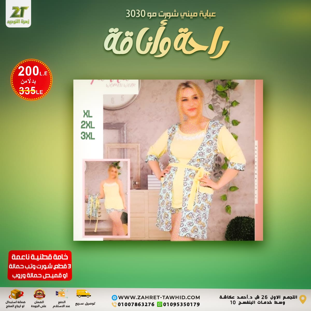 المحتويات: 3 قطع شورت وتوب حمالة (أو قميص حمالة وروب)
